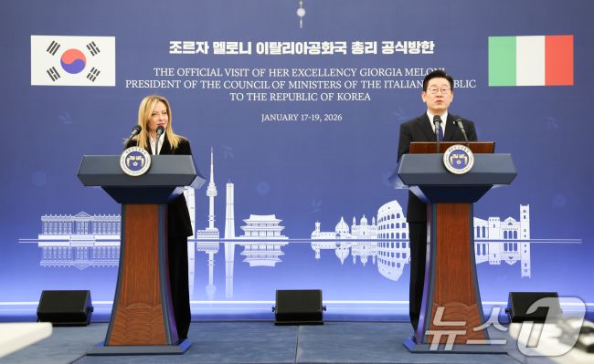 이재명 대통령과 조르자 멜로니 이탈리아 총리가 19일 청와대에서 정상회담 후 공동언론발표를 하고 있다. 2026.1.19/뉴스1 ⓒ News1 이재명 기자 (서울=뉴스1) 이기림 한재준 한병찬 기자 = 이재명 대통령은 19일 조르자 멜로니 이탈리아 총리와의 정상회담 뒤 '공동 언론 발표'에서 "저와 멜로니 총리는 전략적 동반자 명칭에 부합하는 미래지향적 수