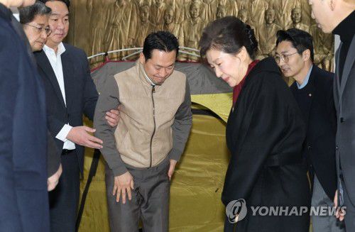 (서울=연합뉴스) 이동해 기자 = 박근혜 전 대통령이 22일 통일교·공천헌금 '쌍특검' 수용을 요구하며 여드레째 단식 중인 국민의힘 장동혁 대표를 국회 로텐더홀 단식 농성장에서 면담하고 있다. 2026.1.22 eastsea@yna.co.kr ▶제보는 카카오톡 okjebo ▶연합뉴스 앱 지금 바로 다운받기~ ▶네이버 연합뉴스 채널 구독하기 <저작권자(c)