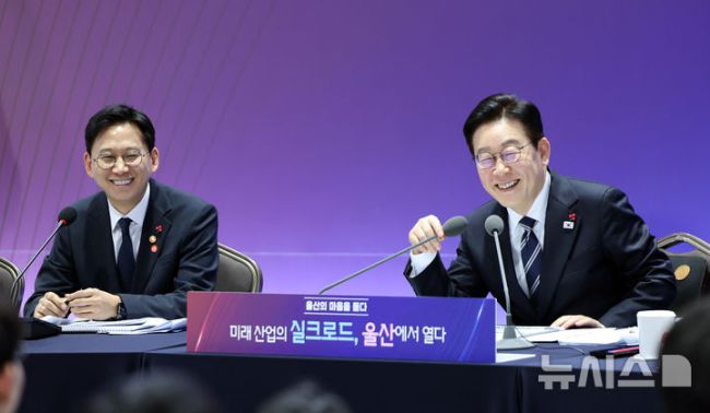 [울산=뉴시스] 최동준 기자 = 이재명 대통령이 23일 울산전시컨벤션센터에서 열린 '울산의 마음을 듣다' 타운홀 미팅에서 발언하며 미소를 짓고 있다. (청와대통신사진기자단) 2026.01.23. photocdj@newsis.com [사진 영상 제보받습니다] 공감언론 뉴시스가 독자 여러분의 소중한 제보를 기다립니다. 뉴스 가치나 화제성이 있다고 판단되는 사진
