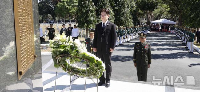 [마닐라=뉴시스] 최동준 기자 = 필리핀을 국빈 방문 중인 이재명 대통령이 4일(현지 시간) 마닐라 영웅묘지 한국전 참전기념비를 방문해 헌화하고 있다. 2026.03.04. photocdj@newsis.com [사진 영상 제보받습니다] 공감언론 뉴시스가 독자 여러분의 소중한 제보를 기다립니다. 뉴스 가치나 화제성이 있다고 판단되는 사진 또는 영상을 뉴시스