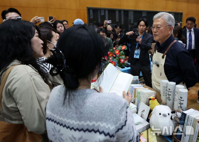 [파주=뉴시스] 이영환 기자 = 문재인 전 대통령이 28일 오후 경기 파주시 아시아출판정보문화센터 지혜의숲 다목적홀에서 열린 DMZ세계문학페스타 2026 북페어 '사이에서' 평산책방 부스에서 시민들에게 도서를 추천하고 있다. 2026.03.28. 20hwan@newsis.com [사진 영상 제보받습니다] 공감언론 뉴시스가 독자 여러분의 소중한 제보를 기다립