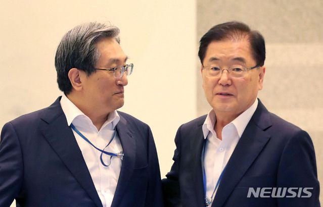 기사내용 요약 직권남용으로 국정원법 위반 혐의 등 내달 재판 절차…법정 출석 의무 없어 [서울=뉴시스] 노영민 전 청와대 비서실장과 정의용 전 국가안보실장이 지난 2019년 8월12일 청와대 여민관에서 열린 수석·보좌관회의에 참석하고 있다. 2019.08.12. (사진=뉴시스DB) photo@newsis.com [서울=뉴시스]박현준 기자 = 이른바 '탈북어