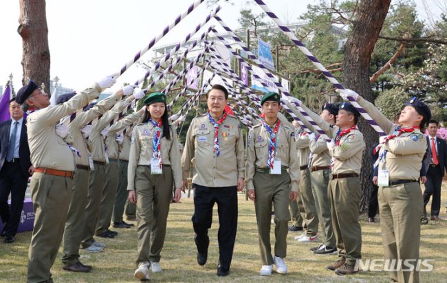 [서울=뉴시스] 홍효식 기자 = 윤석열 대통령이 29일 오후 서울 용산 대통령실 파인그라스 정원에서 열린 한국스카우트연맹 명예총재 추대식에서 스카우트 최고의 예우를 표하는 '장문례'를 받으며 입장하고 있다. '장문례'는 양쪽으로 늘어선 대원들이 구호장(긴봉)으로 삼각형 모양의 문을 만들어 귀빈을 지나게 하는 예우 의식 가운데 하나이다. (대통령실통신사진기자