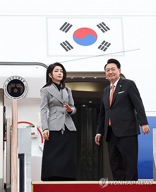 (성남=연합뉴스) 임헌정 기자 = 네덜란드를 국빈 방문하는 윤석열 대통령과 부인 김건희 여사가 11일 경기 성남 서울공항에서 전용기인 공군 1호기에 올라 출국인사를 하고 있다. 2023.12.11 kane@yna.co.kr ▶제보는 카카오톡 okjebo ▶연합뉴스 앱 지금 바로 다운받기~ ▶네이버 연합뉴스 채널 구독하기 <저작권자(c)연합뉴스. 무단전재-재