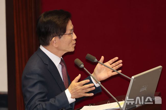 [서울=뉴시스] 권창회 기자 = 김문수 고용노동부 장관이 지난 3일 오후 서울 여의도 국회에서 열린 본회의 긴급현안질문에서 한정애 더불어민주당 의원의 심우정 검찰총장 자녀 외교부 특혜비리 의혹 관련 질의에 답변하고 있다. 2025.04.03. kch0523@newsis.com [서울=뉴시스]하지현 기자 = 김문수 고용노동부 장관은 4일 윤석열 전 대통령의