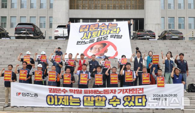 [서울=뉴시스] 조성봉 기자 = 양경수(앞줄 왼쪽 여섯번째) 민주노총 위원장, 박해철(앞줄 왼쪽 일곱번째) 더불어민주당 의원을 비롯한 참석자들이 지난해 8월 26일 오전 서울 여의도 국회 본청 계단에서 열린 '김문수 막말 피해 노동자 기자회견’에서 구호를 외치고 있다 2024.08.26. suncho21@newsis.com [서울=뉴시스] 고홍주 기자 =