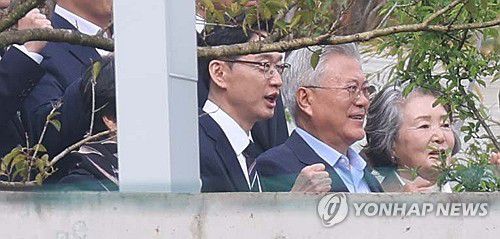 (양산=연합뉴스) 김동민 기자 = 더불어민주당 대권 주자인 김경수 전 경남지사가 14일 오후 경남 양산시 하북면 평산마을 문재인 전 대통령 사저 마당에서 문 전 대통령 내외와 밝은 표정으로 사진 촬영하고 있다. 오른쪽부터 김정숙 여사, 문 전 대통령, 김 전 지사, 김 전 지사 왼쪽 기둥 뒤에는 김 전 지사 부인 김정순 씨. 2025.4.14 image@y