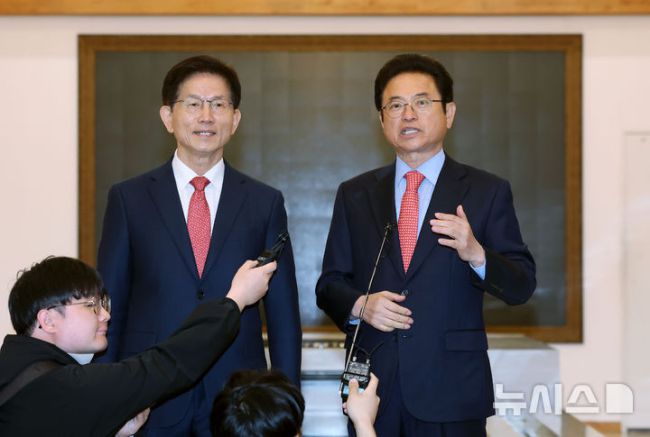 [서울=뉴시스] 홍효식 기자 = 제21대 대통령 선거 출마를 선언한 김문수(왼쪽) 전 고용노동부 장관과 이철우 경북도지사가 15일 오전 서울 마포구 박정희대통령기념관에서 박정희 전 대통령 동상 건립 등 현안 관련 회동하고 있다. 2025.04.15. yesphoto@newsis.com [사진 영상 제보받습니다] 공감언론 뉴시스가 독자 여러분의 소중한 제보를