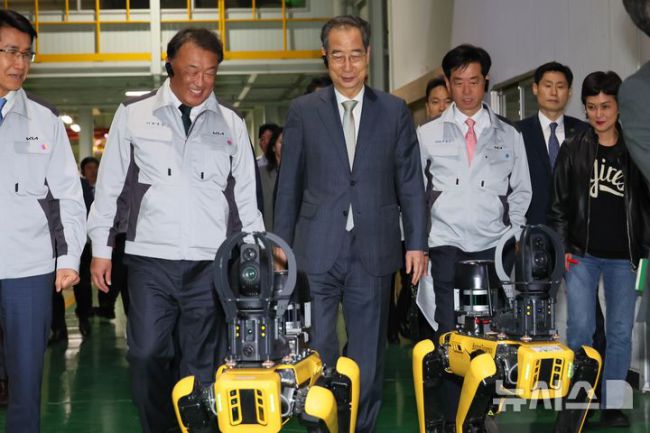 [광주=뉴시스] 조수정 기자 = 한덕수 대통령 권한대행 국무총리가 15일 광주 서구 기아오토랜드 광주공장에서 자동차산업 현장 시찰을 하며 보스턴 다이나믹스 로봇개 '스팟' 시연을 보고 있다. 왼쪽부터 김동욱 현대차·기아 부사장, 최준영 기아 사장, 한 권한대행, 이항수 현대차·기아 부사장. (사진=국무총리실 제공) 2025.04.15. chocrystal@