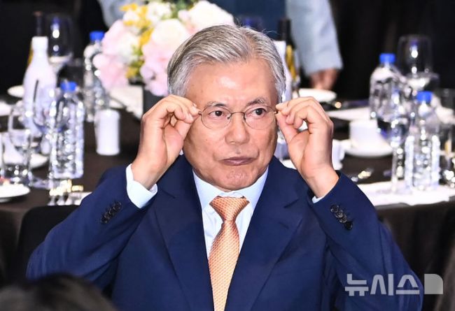 [수원=뉴시스] 김종택 기자 = 문재인 전 대통령 내외가 4일 경기도 수원시 영통구 수원컨벤션센터에서 열린 10.4 남북정상선언 17주년 기념식에 참석해 안경을 고쳐쓰고 있다. 2024.10.04. jtk@newsis.com [서울=뉴시스]정금민 기자 = 문재인 전 대통령이 오는 25일 '4.27 판문점 선언 기념식' 참석을 위해 국회를 방문한다. 문 전