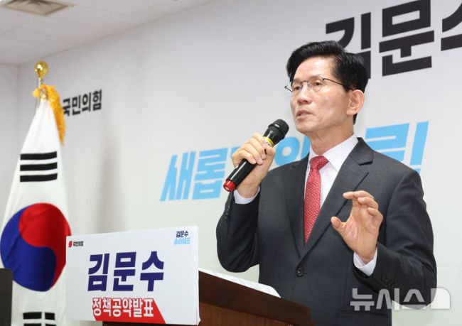 [서울=뉴시스] 고승민 기자 = 김문수 국민의힘 대선 경선 후보가 18일 서울 여의도 캠프 사무실에서 경제 분야 공약 관련 기자회견을 하고 있다. 2025.04.18. kkssmm99@newsis.com [서울=뉴시스] 이재우 기자 = 김문수 국민의힘 대선 경선 후보는 18일 대통령실에 기업 민원 담당 수석 신설 등을 공약했다. 김 후보는 이날 오전 서울