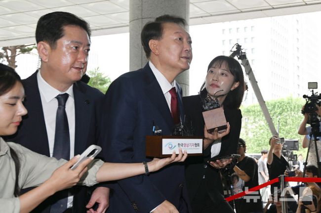 [서울=뉴시스] 이영환 기자 = 윤석열 전 대통령이 28일 오전 대면 조사를 받기 위해 서울 서초구 서울고검에 마련된 내란특검 사무실로 출석하고 있다. (공동취재) 2025.06.28. photo@newsis.com [사진 영상 제보받습니다] 공감언론 뉴시스가 독자 여러분의 소중한 제보를 기다립니다. 뉴스 가치나 화제성이 있다고 판단되는 사진 또는 영상을