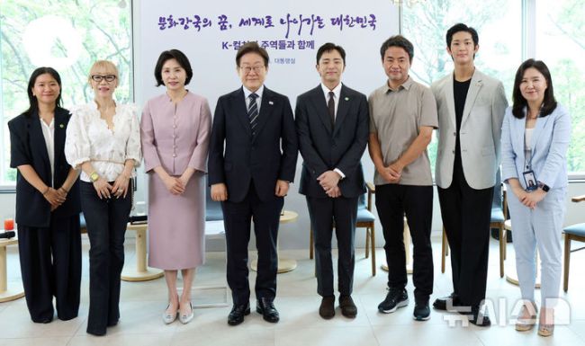 [서울=뉴시스] 고범준 기자 =이재명 대통령과 부인 김혜경 여사가 30일 서울 용산 대통령실 파인그라스에서 열린 문화예술계 수상자 간담회에서 참석자들과 기념촬영을 하고 있다. 2025.06.30. bjko@newsis.com [사진 영상 제보받습니다] 공감언론 뉴시스가 독자 여러분의 소중한 제보를 기다립니다. 뉴스 가치나 화제성이 있다고 판단되는 사진 또는