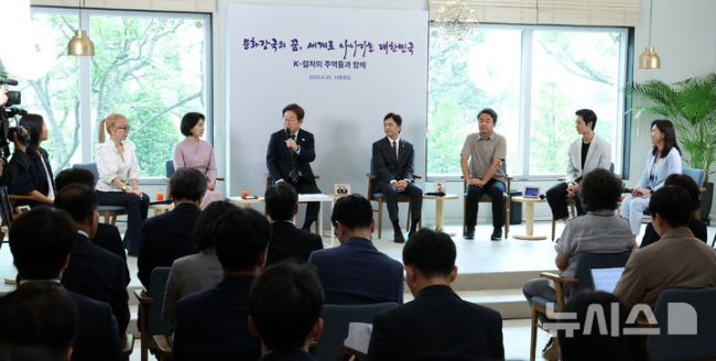 [서울=뉴시스] 고범준 기자 = 이재명 대통령이 30일 서울 용산 대통령실 파인그라스에서 열린 문화예술계 수상자 간담회에서 발언하고 있다. 2025.06.30. bjko@newsis.com [사진 영상 제보받습니다] 공감언론 뉴시스가 독자 여러분의 소중한 제보를 기다립니다. 뉴스 가치나 화제성이 있다고 판단되는 사진 또는 영상을 뉴시스 사진영상부(n-pho