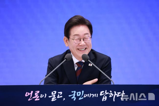 [서울=뉴시스] 고범준 기자 = 이재명 대통령이 3일 청와대 영빈관에서 열린 '대통령의 30일, 언론이 묻고 국민에게 답하다' 기자회견에서 출입기자 질문에 답변하고 있다. (대통령실통신사진기자단) 2025.07.03. bjko@newsis.com [서울=뉴시스] 이창환 기자 = 이재명 대통령은 취임 30일을 맞은 3일 한일 관계와 관련해 "(대통령)선거 때