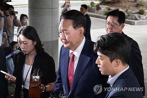 (서울=연합뉴스) 김도훈 기자 = 윤석열 전 대통령이 5일 내란 특검의 2차 조사를 받기 위해 조은석 특별검사팀 사무실이 있는 서울 서초구 서울고검에 출석하고 있다. 윤 전 대통령은 취재진 질문에 아무런 답변을 하지 않았다. 2025.7.5 [공동취재] superdoo82@yna.co.kr ▶제보는 카카오톡 okjebo ▶연합뉴스 앱 지금 바로 다운받기~
