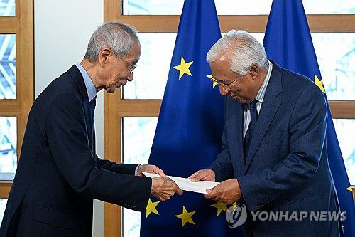 (서울=연합뉴스) 대통령 EU 특사단장인 윤여준 전 환경부 장관이 15일(현지시간) 벨기에 브뤼셀에서 안토니우 코스타 EU 정상회의 상임의장에게 한·EU 관계 강화에 대한 이재명 대통령의 메시지가 담긴 친서를 전달하고 있다. 2025.7.17 [외교부 제공. 재판매 및 DB 금지] photo@yna.co.kr ▶제보는 카카오톡 okjebo ▶연합뉴스 앱 지