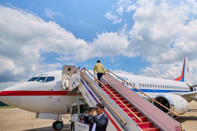 [서울=뉴시스] 대통령실은 이재명 대통령이 지난 21일 호우 피해지역 방문을 위해 전용기에 탑승하고 있는 모습을 22일 SNS에 공개했다. (사진=이재명 대통령 SNS) 2025.07.22. photo@newsis.com *재판매 및 DB 금지 [사진 영상 제보받습니다] 공감언론 뉴시스가 독자 여러분의 소중한 제보를 기다립니다. 뉴스 가치나 화제성이 있다고