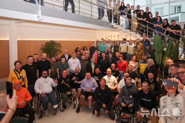 [르비우=AP/뉴시스] 찰스 3세 영국 국왕의 차남 해리(앞줄 가운데) 왕자가 10일(현지 시간) 우크라이나 르비우에 있는 정형외과 병원 '슈퍼휴먼 센터'(Superhumans Center)를 방문해 러시아와 전쟁 중 부상한 사람들과 함께 기념 촬영하고 있다. 해리 왕자는 이곳에서 치료 중인 환자들을 만나 이야기를 나누며 그들의 회복 과정을 격려한 것으로