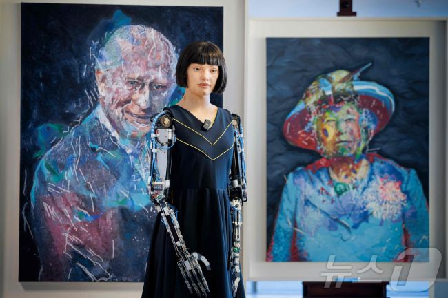 (제네바 AFP=뉴스1) 윤다정 기자 = 9일(현지시간) 스위스 제네바에서 국제전기통신연합(ITU) 주최로 열린 'AI 포 굿(AI for Good) 글로벌 정상회의' 행사장에서 인간형 예술가 로봇 아이-다(Ai-Da)가 자신이 그린 찰스 3세 영국 국왕과 엘리자베스 2세 여왕의 초상화 앞에 서 있다. 2025.07.09. ⓒ AFP=뉴스1 Copyrigh