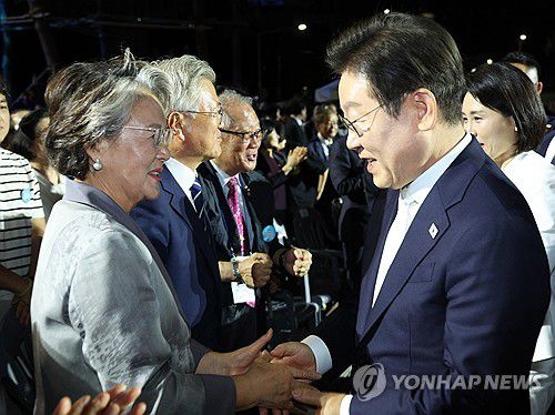 (서울=연합뉴스) 홍해인 기자 = 이재명 대통령이 15일 서울 광화문광장에서 열린 제21대 대통령 국민임명식 행사에서 김정숙 여사와 인사하고 있다. 2025.8.15 hihong@yna.co.kr ▶제보는 카카오톡 okjebo ▶연합뉴스 앱 지금 바로 다운받기~ ▶네이버 연합뉴스 채널 구독하기 <저작권자(c) 연합뉴스, 무단 전재-재배포, AI 학습 및 활