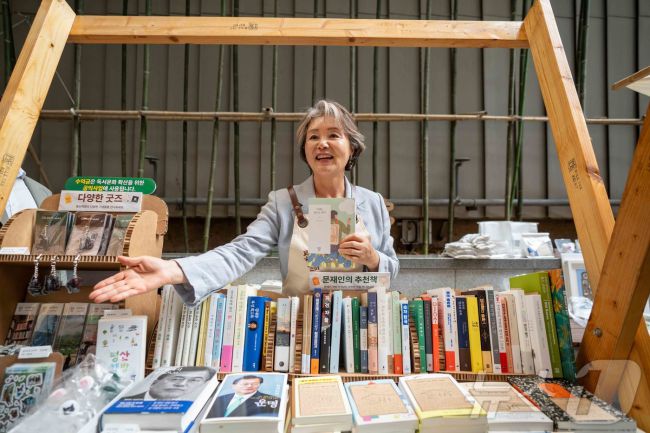 (광주=뉴스1) 최성국 기자 = 김정숙 여사가 27일 오후 국립아시아문화전당에서 열린 '북(BOOK)적 북(BOOK)적한 하루-책 읽는 ACC'에 마련된 '평산책방' 부스에서 문 전 대통령이 추천하는 서적을 소개하고 있다. (ACC 제공. 재판매 및 DB 금지) 2025.9.27/뉴스1 stare@news1.kr Copyright ⓒ 뉴스1. All rig