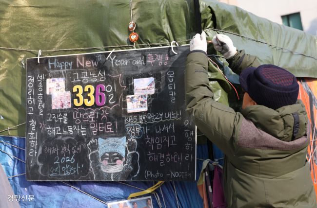 336일 만에 고공 농성장에서 내려와 땅을 밟은 고진수 민주노총 서비스연맹 세종호텔지부장은 잠시 눈을 감았다. 얼굴에는 긴 시간을 버텨낸 피로보다 앞을 향한 결연함이 더 짙게 남아 있었다. 서울 중구 세종호텔 앞 10m 철제 구조물에 올라 매서운 더위와 추위를 견디며 사계절을 보낸 그는 이제 지상에서 투쟁을 이어간다. 세종호텔 요리사로 일하던 고 지부장을
