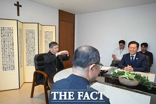 정청래 더불어민주당 대표(오른쪽)가 14일 오후 서울 중구 한국천주교서울대교구청에서 서울대교구장 정순택 대주교를 예방해 대화를 나누고 있다. /국회사진기자단 [더팩트ㅣ국회사진기자단] 정청래 더불어민주당 대표(오른쪽)가 14일 오후 서울 중구 한국천주교서울대교구청에서 서울대교구장 정순택 대주교를 예방해 대화를 나누고 있다. ilty012@tf.co.kr 사진