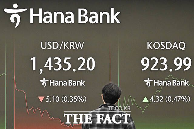 올해 연평균 원·달러 환율이 역대 최고 수준인 1420원대를 기록할 것으로 예측되는 가운데 29일 오전 서울 중구 을지로 하나은행 딜링룸 전광판에 경제지수가 표시되고 있다. /송호영 기자 이날 오전 1435원대를 기록한 환율. 올해 연평균 원·달러 환율이 역대 최고 수준인 1420원대를 기록할 것으로 예측되는 가운데 29일 오전 서울 중구 을지로 하나은행