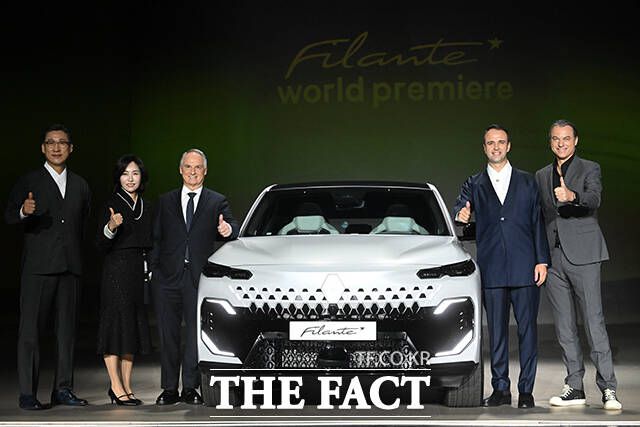 최성규 르노테크놀로지코리아 연구소장과 상희정 르노코리아 대·내외전략본부장, 파브리스 캄볼리브 르노그룹 최고 성장 책임자 및 르노 브랜드 CEO, 니콜라 파리 르노코리아 사장, 로렌스 반 덴 아커 르노그룹 디자인 총괄 부회장(왼쪽부터)이 13일 오전 서울 광진구 그랜드 워커힐에서 열린 르노코리아 글로벌 플래그십 미디어 공개 행사에 참석해 르노 필랑트 차량과