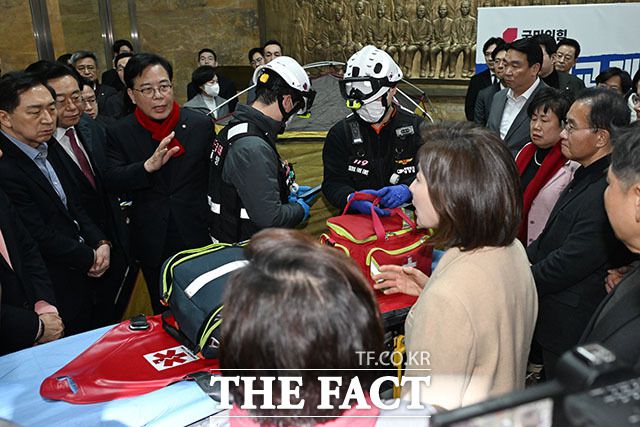 119 구급 대원들이 21일 오후 서울 여의도 국회 로텐더홀에서 단식중인 장동혁 국민의힘 대표를 병원으로 이송하려다 장 대표의 거부로 돌아가고 있다. /국회=남용희 기자 구급대원들의 이송 거부. 휴식 취하는 장 대표. 119 대원들이 21일 오후 서울 여의도 국회 로텐더홀에서 단식중인 장동혁 국민의힘 대표를 병원으로 이송하려다 장 대표의 거부로 돌아가고 있