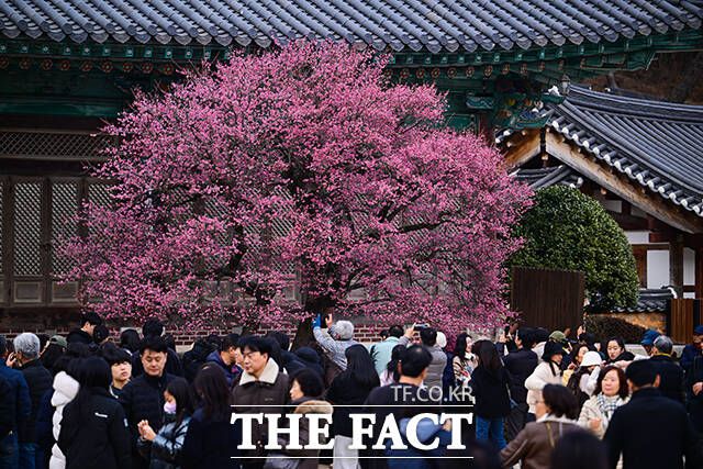 설을 하루 앞둔 16일 오후 경남 양산 통도사에 홍매화가 펴있다. /양산=박헌우 기자 설을 하루 앞둔 16일 오후 경남 양산시 통도사에 '봄의 전령'으로 불리는 홍매화가 피어 있다. 통도사는 매년 개화 시기마다 많은 관광객들이 찾은 대표적인 봄꽃 명소로, 사찰의 고요함과 홍매화의 은은한 향이 어우러져 색다른 모습을 선보인다. cjg05023@tf.co.kr