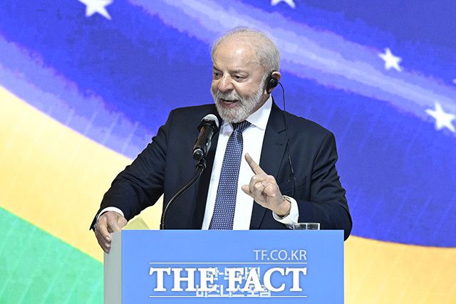 국빈 방한 중인 루이스 이나시우 룰라 다시우바 브라질 대통령이 23일 오후 서울 중구 롯데호텔서울 크리스탈볼룸에서 열린 '한-브라질 비지니스 포럼'에 참석해 발언하고 있다. /송호영 기자 룰라 대통령이 김정관 산업통상부 장관과 기념사진을 촬영하고 있다. 국빈 방한 중인 루이스 이나시우 룰라 다시우바 브라질 대통령이 23일 오후 서울 중구 롯데호텔서울 크리스