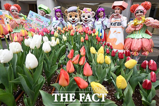 '에버랜드 튤립축제' 개막을 이틀 앞둔 18일 오후 서울 중구 에잇세컨즈 명동점 앞에서 에버랜드 캐릭터와 공연 연기자들이 포즈를 취하고 있다. /김성렬 기자 '에버랜드 튤립축제' 개막을 이틀 앞둔 18일 오후 서울 중구 에잇세컨즈 명동점 앞에서 에버랜드 캐릭터와 공연 연기자들이 포즈를 취하고 있다. 에버랜드는 오는 20일부터 튤립과 수선화, 무스카리 등 1