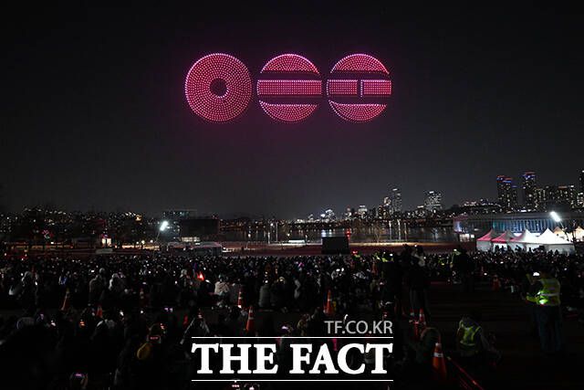 ‘BTS 완전체로 돌아왔다’ 드론쇼 펼쳐지는 뚝섬 한강공원 [TF사진관]