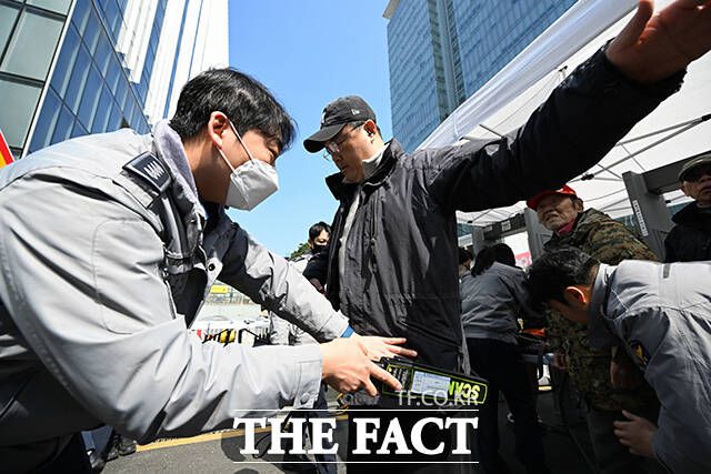 그룹 방탄소년단(BTS)의 컴백 라이브를 앞둔 21일 오전 서울 종로구 광화문 일대에 설치된 게이트에서 경찰이 신체검사를 하고 있다. /박헌우 기자 광화문 일대에 위험 물품 검문·검색을 위한 게이트가 설치돼 있다. 그룹 방탄소년단(BTS)의 컴백 라이브를 앞둔 21일 오전 서울 종로구 광화문 일대에 설치된 게이트에서 경찰이 신체검사를 하고 있다. 이날 약
