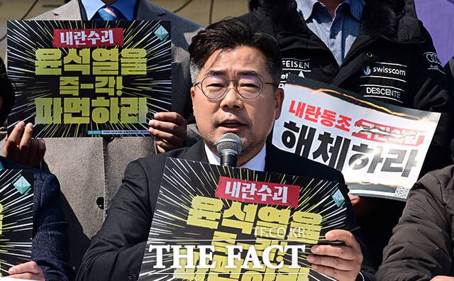 박찬대 더불어민주당 원내대표가 31일 오전 서울 광화문 농성장 앞에서 윤석열 즉각 파면을 위한 제정당 전국 긴급 집중 행동 선포 기자회견에 참석해 발언을 하고 있다. /임영무 기자 박찬대 더불어민주당 원내대표가 31일 오전 서울 광화문 농성장 앞에서 윤석열 즉각 파면을 위한 제정당 전국 긴급 집중 행동 선포 기자회견에 참석해 발언을 하고 있다. 이날 기자회
