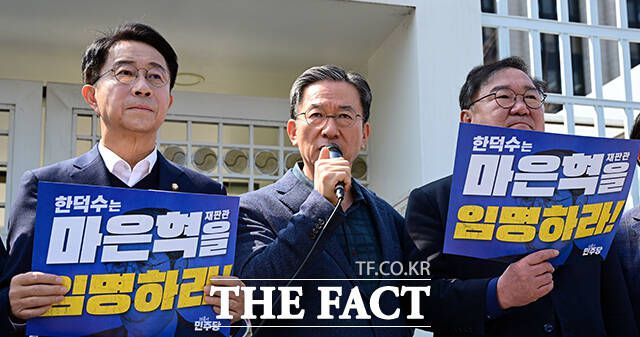 정성호 더불어민주당 의원(가운데)이 31일 오후 서울 종로구 정부서울청사 앞에서 열린 '마은혁 재판관 미임명, 한덕수 대행 강력 규탄' 더불어민주당 4·5·6선 국회의원 공동성명에 참석해 발언을 하고 있다. /임영무 기자 더불어민주당 중진의원들이 31일 오후 서울 종로구 정부서울청사 앞에서 열린 '마은혁 재판관 미임명, 한덕수 대행 강력 규탄' 더불어민주당