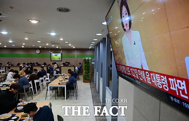 윤석열 전 대통령의 파면이 결정된 4일 오전 서울 종로구 정부서울청사 구내식당의 공무원들이 파면 관련 속보를 보고 있다. /임영무 기자 윤석열 전 대통령의 파면이 결정된 4일 오전 서울 종로구 정부서울청사 구내식당의 공무원들이 파면 관련 속보를 보고 있다. 헌법재판소는 재판관 만장일치 의견으로 국회의 탄핵소추의결을 인용했다. 문형배 헌법재판소장 권한대행은