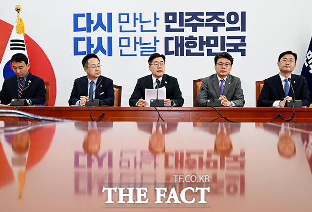 박찬대 더불어민주당 당대표 직무대행 겸 원내대표(가운데)가 10일 오전 서울 여의도 국회에서 열린 정책조정회의에 참석해 모두발언을 하고 있다. /국회=배정한 기자 모두발언하는 박찬대 원내대표(왼쪽 두번째). 박찬대 더불어민주당 당대표 직무대행 겸 원내대표(가운데)가 10일 오전 서울 여의도 국회에서 열린 정책조정회의에 참석해 모두발언을 하고 있다. 박 직무