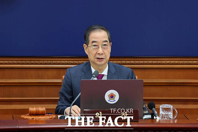 한덕수 대통령 권한대행 국무총리가 14일 오전 서울 종로구 정부서울청사에서 열린 국무회의에 참석해 모두발언을 하고 있다. /국무총리실 한덕수 대통령 권한대행 국무총리가 14일 오전 서울 종로구 정부서울청사에서 열린 국무회의에 참석해 모두발언을 하고 있다. 한덕수 대통령 권한대행 국무총리는 미국발 글로벌 통상전쟁 대응과 관련해 "저에게 부여된 마지막 소명"이