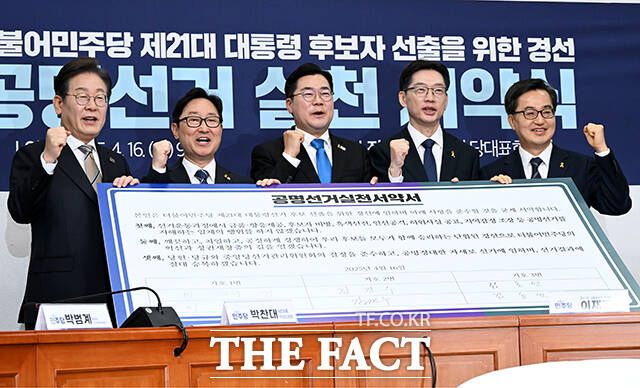 제21대 대통령 선거 출마를 선언한 이재명 더불어민주당 전 대표와 김경수 전 경남도지사, 김동연 경기도지사(왼쪽부터)가 16일 오전 서울 여의도 국회에서 열린 경선 후보자 공명선거 실천 서약식에 참석해 기념사진 촬영을 하고 있다. 왼쪽부터 이 전 대표, 박범계 중앙당선거관리위원장, 박찬대 당대표 직무대행 겸 원내대표, 김 전 경남도지사, 김 경기도지사. /