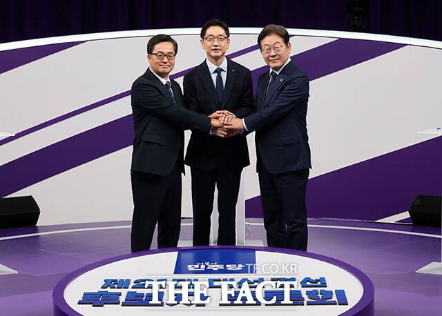 더불어민주당 대선 경선 후보인 김동연 경기지사, 김경수 전 경남지사, 이재명 전 대표(왼쪽부터)가 18일 오후 서울 상암동 MBC에서 열린 첫 TV토론회에 참석해 선전을 다짐하고 있다. /국회사진취재단 김동연 경기지사, 김경수 전 경남지사, 이재명 전 대표(왼쪽부터)가 파이팅을 외치고 있다. [더팩트ㅣ국회사진취재단] 더불어민주당 대선 경선 후보인 김동연 경