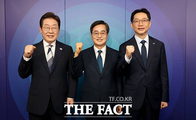 더불어민주당 제21대 대통령선거 경선에 나선 이재명, 김동연, 김경수 예비후보(왼쪽부터)가 23일 오후 서울 여의도 오마이TV 스튜디오에서 열린 오마이TV 초청 토론회에 참석해 기념촬영을 하고 있다. /국회사진취재단 더불어민주당 제21대 대통령선거 경선에 나선 김경수, 김동연, 이재명 예비후보(가나다 순)가 23일 오후 서울 여의도 오마이TV 스튜디오에서