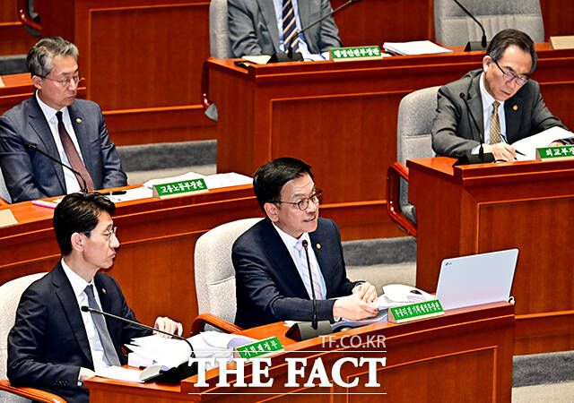 최상목 경제부총리 겸 기획재정부 장관(가운데)이 29일 오전 서울 여의도 국회에서 열린 예산결산특별위원회 전체회의에 참석해 질의에 답변을 하고 있다. /국회=배정한 기자 한덕수 대통령 권한대행 겸 국무총리의 빈자리. 최상목 경제부총리 겸 기획재정부 장관(가운데)이 29일 오전 서울 여의도 국회에서 열린 예산결산특별위원회 전체회의에 참석해 질의에 답변을 하고