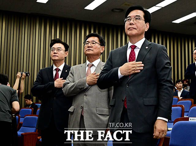 김성원, 이헌승, 송언석 국민의힘 원내대표 후보(왼쪽부터)가 16일 오후 서울 여의도 국회에서 열린 원내대표 선출 의원총회에 참석해 국기에 대한 경례를 하고 있다. /국회=배정한 기자 송언석, 이헌승, 김성원 국민의힘 원내대표 후보가 투표에 앞서 토론을 진행하고 있다. 김성원, 이헌승, 송언석 국민의힘 원내대표 후보(왼쪽부터)가 16일 오후 서울 여의도 국