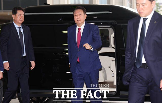 윤석열 전 대통령(가운데)이 5일 오전 서울 서초구 서울고검 청사에 마련된 '내란 특검' 사무실에 피의자 신분으로 출석하고 있다. /배정한 기자 윤석열 전 대통령(가운데)이 5일 오전 서울 서초구 서울고검 청사에 마련된 '내란 특검' 사무실에 피의자 신분으로 출석하고 있다. 이날 윤 전 대통령은 지난 1차 조사와 마찬가지로 윤 전 대통령은 지하 주차장이 아
