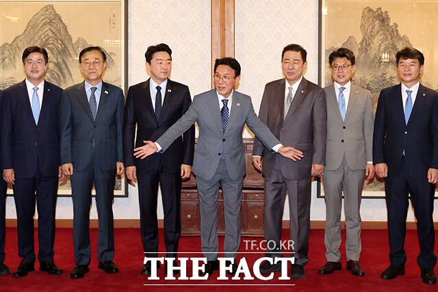 김민석 국무총리(가운데)와 김병기 더불어민주당 대표 직무대행 겸 원내대표(왼쪽 다섯번째), 강훈식 대통령 비서실장(왼쪽 세번째) 등이 6일 오후 서울 종로구 삼청동 국무총리 공관에서 열린 이재명 정부 첫 고위당정협의회에서 기념촬영을 하고 있다. /배정한 기자 밝은 표정으로 인사하는 김민석 국무총리와 강훈식 대통령 비서실장, 김병기 더불어민주당 대표 직무대행