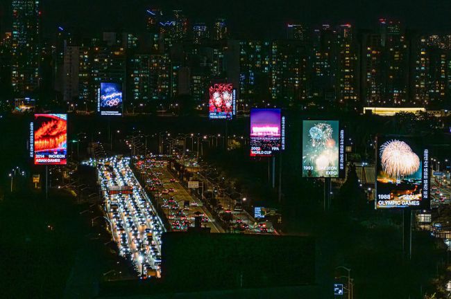 로드블록 여의12의 ‘대한민국의 영광을 밝혀온 불꽃’ 미디어아트 전경. 올이즈웰 제공 22일 국내 최대 규모의 불꽃축제인 ‘서울세계불꽃축제 2025’를 맞아 축제장소인 서울 올림픽대로 여의도 구간에 초대형 미디어아트 ‘로드블록 여의12’가 전시되고 있다. ‘1988 서울올림픽’, ‘1993 대전엑스포’, ‘2002 한일월드컵’, ‘2012 여수엑스포’, ‘