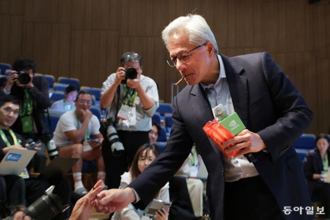 젠슨 황 엔비디아 최고경영자(CEO)가 31일 경북 경주시 경주예술의전당 원화홀에서 열린 엔비디아 기자회견에서 취재진에게 과자를 건네고 있다. 박형기 기자 oneshot@donga.com 31일 경북 경주예술의전당에서 열린 엔비디아 기자회견에서 젠슨 황 엔비디아 최고경영자는 피곤한 모습에도 웃음을 잃지 않았다. 전날 서울에서 성사된 ‘치맥 회동’에 이어 경